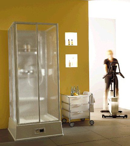 und einer voll ausgeschäumten Duschwanne. Auch zur Komplettdusche gehört eine Duschstange, eine Brausegarnitur sowie eine